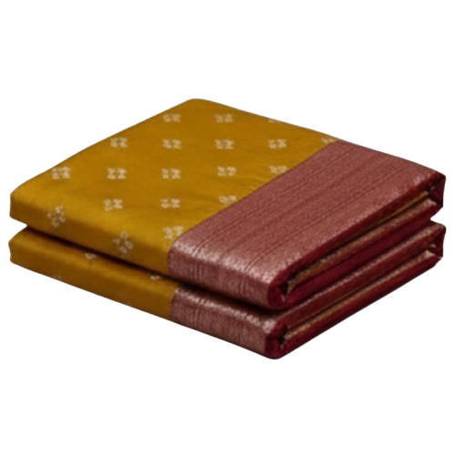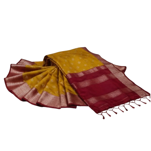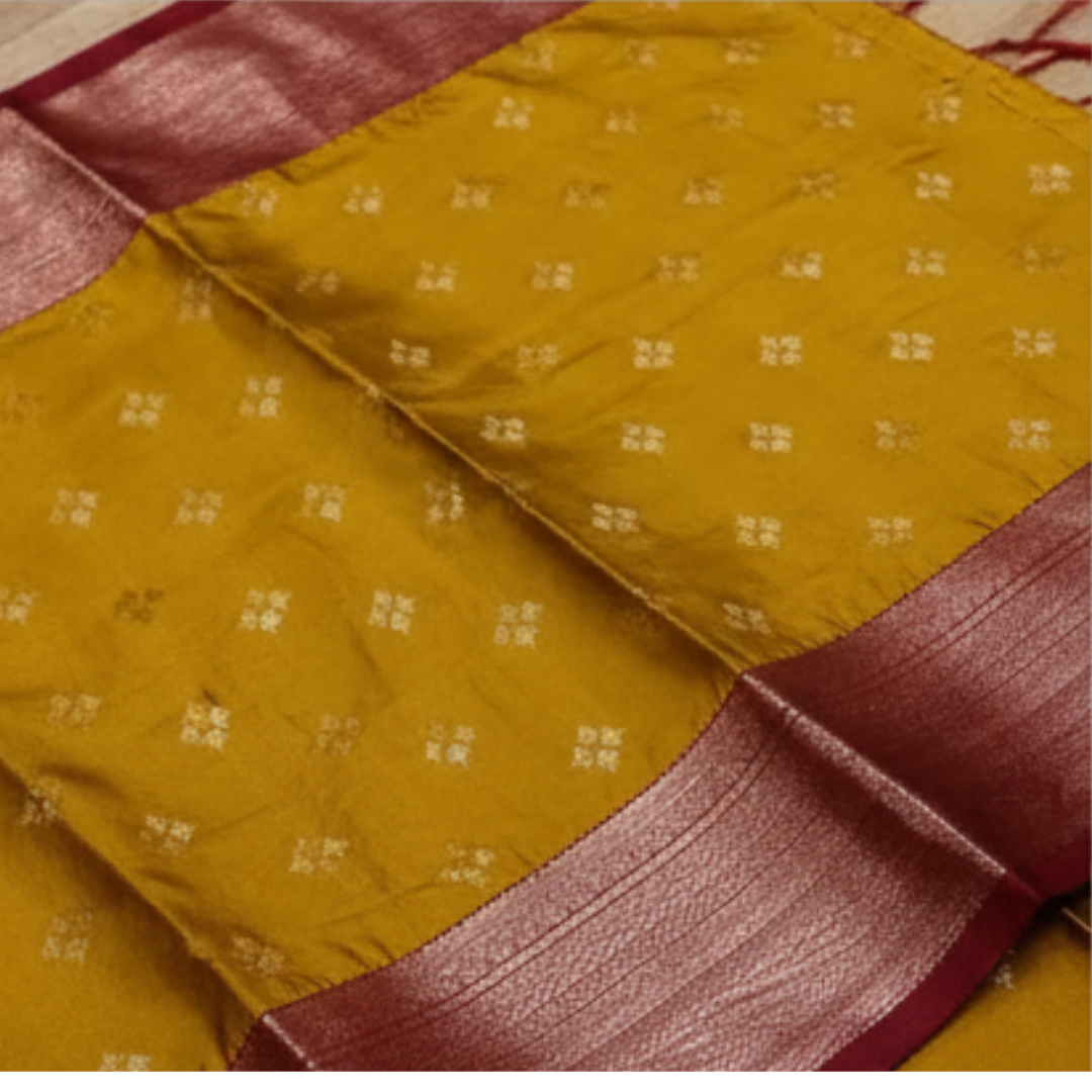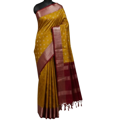 This elegant silk saree features a rich mustard yellow body with a subtle sheen, accented by delicate silver motifs. The striking contrast comes from the deep maroon border and pallu, which are intricately woven with traditional zari patterns. This combination of classic colors and detailed craftsmanship makes it a perfect choice for festive occasions, offering a look that is both traditional and effortlessly stylish.
