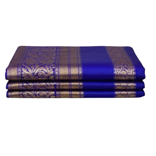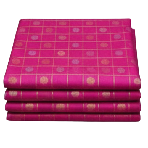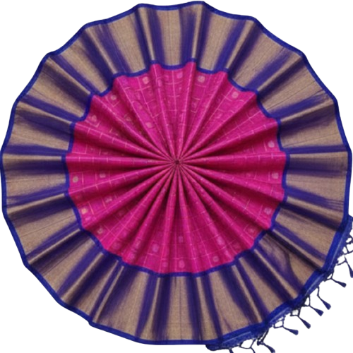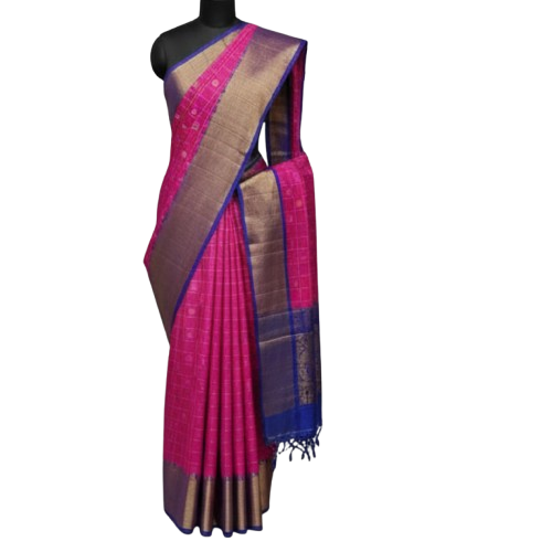 This stunning Pattu silk saree features a vibrant rani pink body with gold checked patterns and circular motifs. The saree is framed by a bold royal blue border and a rich pallu, both intricately woven with gold zari work. This classic combination of colors and traditional design creates a regal and elegant look, perfect for weddings, festivals, and grand celebrations.